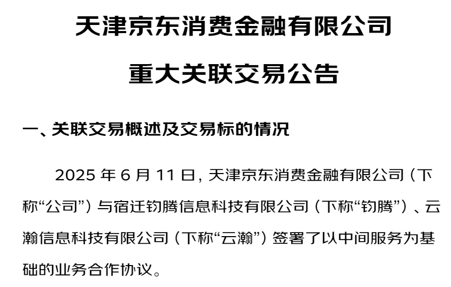 另一方面,京东消金与京东科技的融合也已迈入实质阶段,且已进入京东金融业务生态开始展业。7月1日,京东消费金融在官网披露重大关联交易信息显示,2025年6月11日,公司与宿迁钧腾信息科技有限公司(简称:钧腾)、云瀚信息科技有限公司(简称:云瀚)签署了以中间服务为基础的业务合作协议,公司2025年与钧腾、云瀚开展业务合作事项及已于公司股东会第八次会议审议通过。