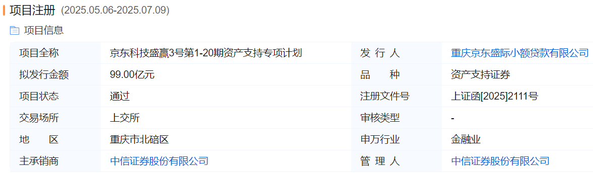 在拿下消金牌照后,京东科技旗下小贷公司拟发行的一笔99亿元规模的资产支持证券(ABS)迎来重要进展。7月9日,上海证券交易所披露信息显示,重庆京东盛际小额贷款有限公司(简称:京东小贷)作为发行人的“京东科技盛赢3号第1-20期资产支持专项计划”状态已更新为“已通过”,该债券项目拟发行总额为人民币99亿元,受理日期为2025年5月6日,品种为资产支持证券(ABS),由中信证券承销。