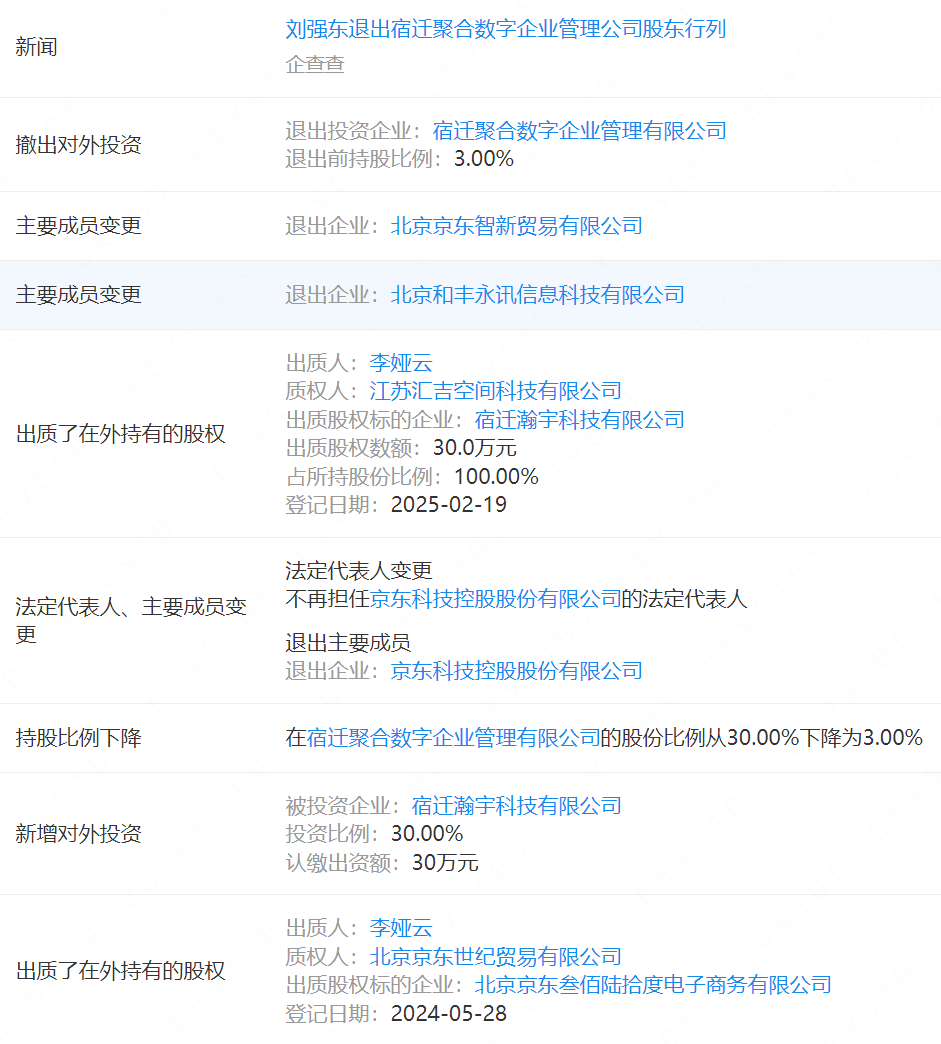 虎讯APP发现,除京东科技外,李娅云近一年来已逐步退出多家京东关联公司的高管职位,并向京东关联公司出质了其持有的股权。企查查信息显示,2024年5月下旬,李娅云出质北京京东叁佰陆拾度电子商务有限公司股权数额87600,质权人为北京京东世纪贸易有限公司;今年2月,李娅云出质了在宿迁瀚宇科技有限公司持有的30万元(30%)股权,质权人为江苏汇吉空间科技有限公司;4月,她退出了北京和丰永讯信息科技有限公司和北京京东智新贸易有限公司的监事职务。