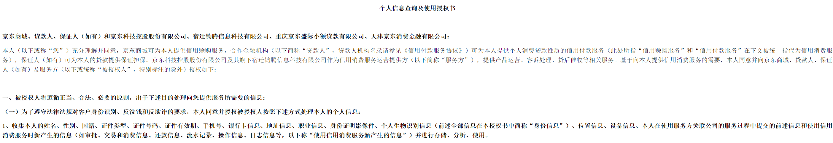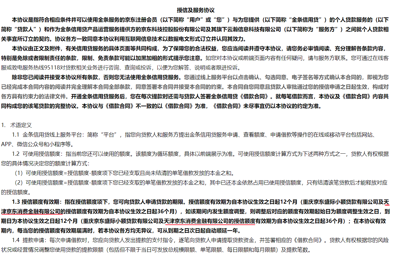根据京东金条授信及服务协议,京东金条信用贷的贷款服务方已经包含京东消费金融,在授信额度有效期中,重庆京东盛际小额贷款有限公司及天津京东消费金融有限公司的授信额度有效期为协议生效之日起36个月。同时,在个人消费贷款性质的信用付款服务的个人信息查询及使用授权书中,京东消费金融已与京东商城、京东科技、钧腾公司、京东小贷等主体作为重要关联方“整体”共同在列。