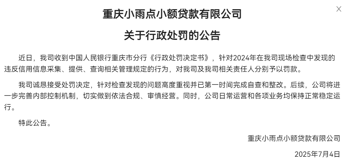 7月6日,据北京商报报道,小雨点回应称,“人民银行重庆市分行对我司2023年1月1日—2024年7月31日期间征信管理事项进行了全量检查;本次检查属于行业常规执法检查,也是我司自2017年8月接入人行征信以来,第一次接受人民银行的现场执法检查。针对检查发现存在违反信用信息采集、提供、查询相关管理规定的行为进行了处罚”。谈及此次罚单是否会影响公司业务,小雨点称,“公司业务均保持正常、稳定运行,并不受此事件影响”。