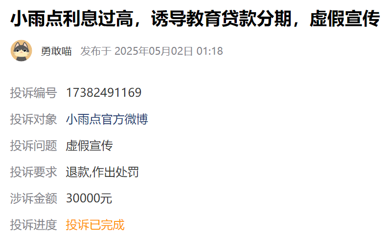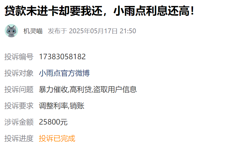 通过上述信息综合来看,重庆小贷公司的本金、利息及罚息,最高年化率不应超过24%,超过部分,在借款合同纠纷的审理中,很难获得法院和地方监管的支持。据黑猫平台信息显示,小雨点的累计投诉量为2200条,近30天为23条。其中,亦有用户对其“利率较高”的投诉。
