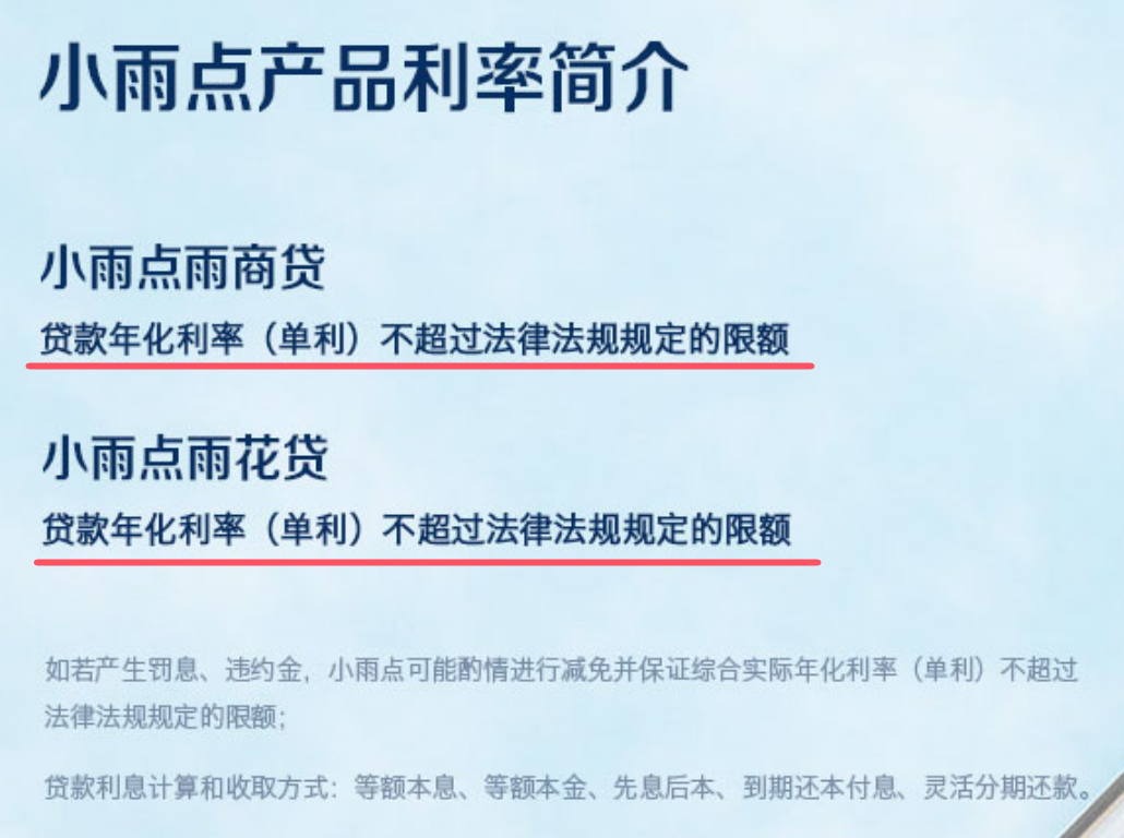 在此次被处罚背后,虎讯APP注意到,当前,在小雨点贷款官网,其有关雨商贷和雨花贷产品利率的披露仍存在“模糊”表述,仅称其贷款年化利率(单利)不超过法律法规规定的限额。在小雨点官网的小雨点信贷信息披露及风险提示中,有关雨商贷和雨花贷的利率表述为:”贷款年化利率(单利)区间为0%至法律法规规定的限额,包括利息、费用、罚息、违约金在内的综合实际年化利率(单利)不超过法律法规规定的限额“。这样的表述疑似侵犯了金融消费者的知情权。